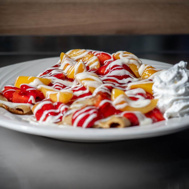Our homemade crepes filled with strawberries and peaches. Topped with fruit and our homemade sauce.