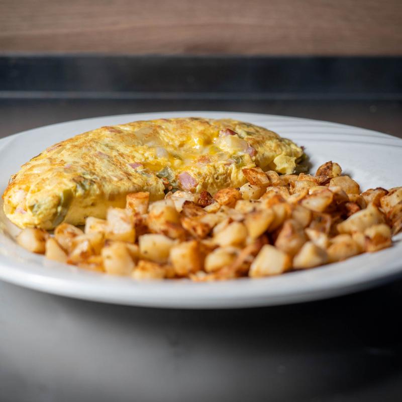 Three eggs blended with ham, green onions, bell peppers, and tomatoes. Covered in melted Monterey Jack and cheddar cheese. Served with salsa.