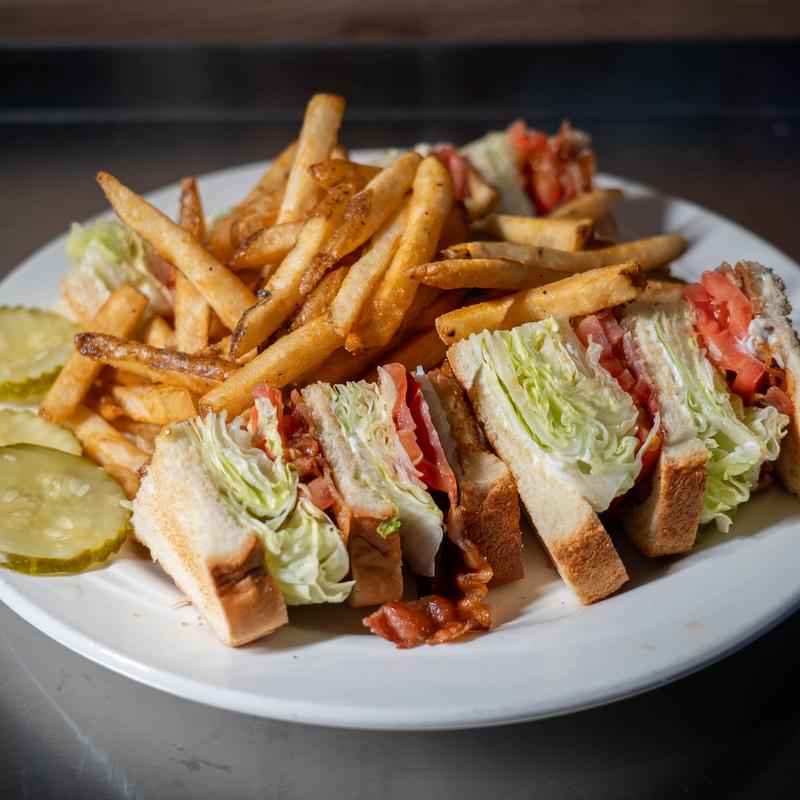 Whole wheat toast piled high with crisp bacon, avocado, tomatoes, Swiss cheese, lettuce, and mayonnaise.